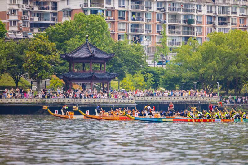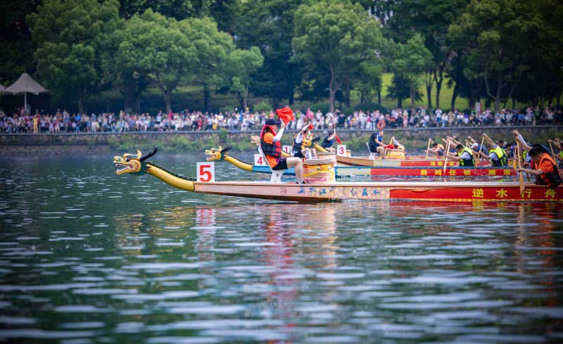 隨著一聲令下,四支龍舟如離弦之箭破浪而出,江面上水花飛濺,龍首劈波斬浪,各隊你追我趕,難分伯仲,陣陣鼓聲與“加油”聲浪此起彼伏。